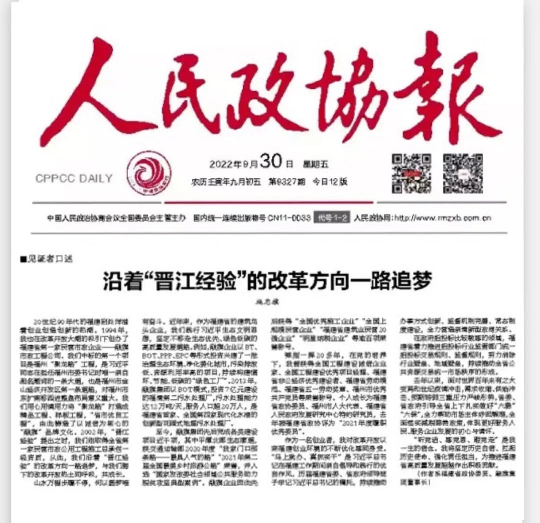 《人民政协报》刊登董事长施忠旗文章 沿着“晋江经验”的改革方向一路追梦发布日期:2022-09-30