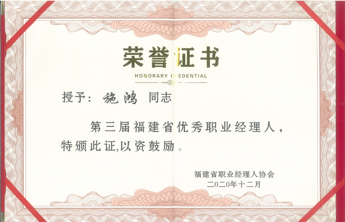 2020年12月19日,福建省第三届职业经理人峰会在福州召开。来自全省各行各业的职业经理人代表汇聚一堂,共同见证优秀职业经理人的评选结果。福建省政协副主席洪捷序,福建省工商联党组成员、副主席兼秘书长陈飚,福建省工商联副主席、祥龙集团董事长、福建省职业经理人协会会长景浓等领导嘉宾出席本次会议。福建省融旗工业厂房开发建设有限公司总经理施鸿出席此次峰会,并荣获“福建省优秀职业经理人”殊荣。