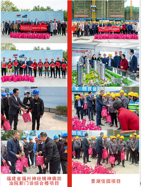 2020年1月9日,福州市直城乡建设系统党委陈瑞叔书记、市城建工会田英主席、福州市建筑业协会会长、融旗集团施忠旗董事长等前往福州建工(集团)总公司承建的福建省福州神经精神病防治院新门诊综合楼项目、福州市城投建筑有限公司承建的景湖佳园项目开展“迎新春送温暖”慰问活动,为临近春节依然坚守施工现场和冬日温暖。