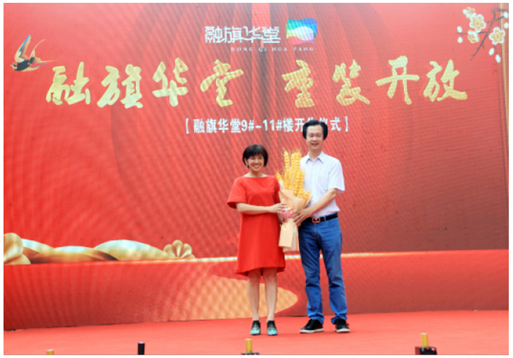 随后北海琦玮房地产开发有限公司唐丽晨副总经理为施忠旗董事长献上大麦花,取“大卖”之谐音,预示着融旗华堂项目开盘即火。