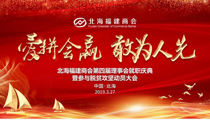 2019年3月27日,北海福建商会第四届理事会就职庆典暨参与脱贫攻坚动员大会在广西北海隆重举行。北海市委常委统战部部长毛艳琼、福建省工商联总商会副会长施忠旗、广西福建总商会会长林谋悦、福建省南安市副市长李少敏,广西各地市福建商会领导、北海各异地商协会领导、各机关单位,媒体以及在北海的闽商闽人参加了此次大会。