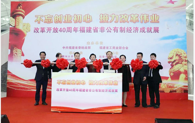 2018年12月5日,“不忘创业初心 接力改革伟业”——改革开放40周年福建省非公有制经济成就展开幕式在福州市图书馆隆重举行。福建省委常委、统战部部长雷春美出席开幕式并讲话,省委统战部常务副部长臧杰斌,省税务局局长赵静,福州大学党委书记陈永正,省自然资源厅巡视员蔡伟等领导出席开幕式。省委统战部副部长、省工商联党组书记李家荣主持开幕式。福建省工商联(总商会)副会长、融旗集团董事长施忠旗及福建省其他非公有制经济人士参会。