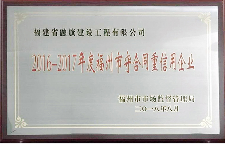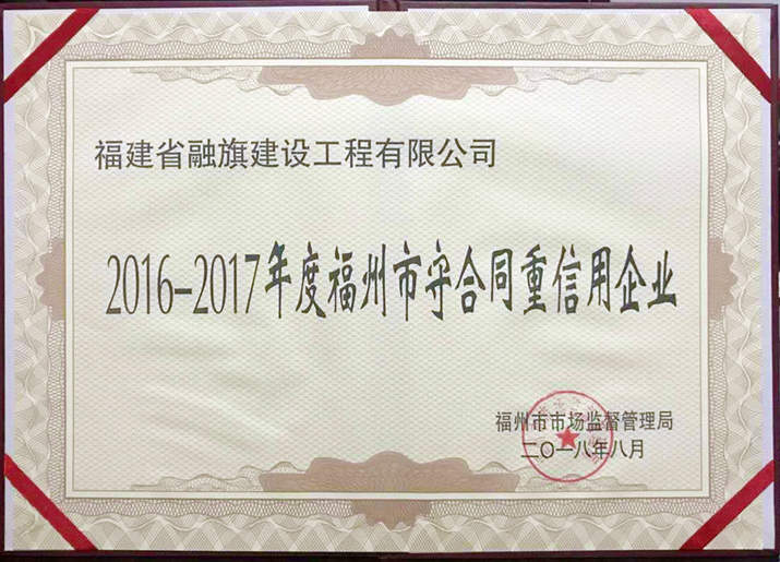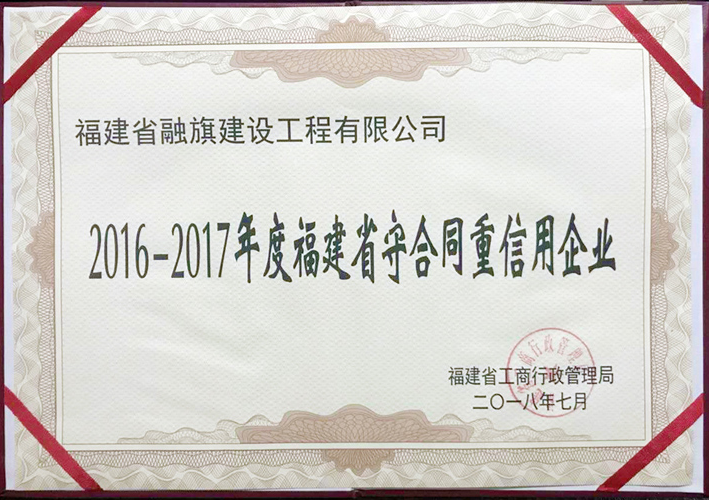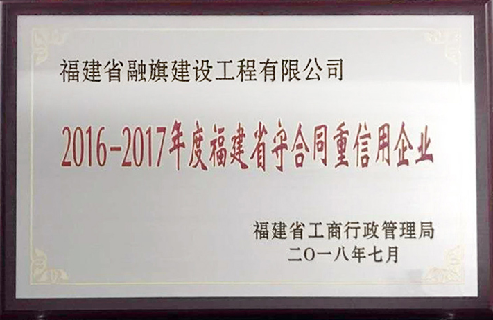 近日,融旗集团通过福建省工商行政管理局、福州市市场监督管理局考核,获得“2016-2017年度福建省、福州市守合同重信用企业”荣誉。