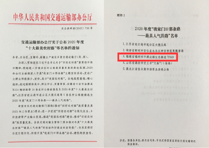 近日,交通运输部办公厅公布2020年度全国“十大最美农村路”等名单。由福建融旗集团承建的“平潭北部生态廊道Y049”荣获2020年度“我家门口那条路——最具人气的路”。