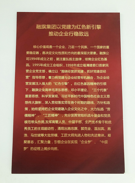 一是融旗集团高度重视党建工作。配备专职党务工作人员,要求公司各部门负责人支持配合党支部工作;加大党组织活动经费的投入,党建工作经费列入企业年度经费预算;改善党支部工作办公条件,配置相应的设施设备;创建党史党建展览教育基地,加强对员工的政治思想教育;创新党建工作机制,将党建工作延伸到每个工程项目部,扩大党建工作覆盖面。
