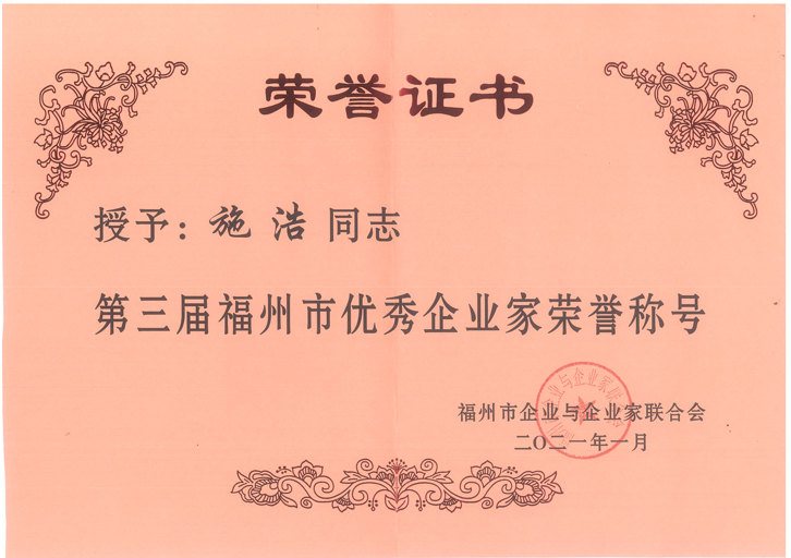 2021年3月12日,福州市企业与企业家联合会召开2020年年会暨表彰大会。福州市委常委、市政府常务副市长蔡战胜出席会议并做重要讲话,市企业与企业家联合会会长徐诗文主持会议。会议隆重表彰了在社会主义现代化建设和企业改革发展中做出突出贡献的企业家,融旗集团副总经理施浩凭借在践行社会责任等方面的突出表现,被授予“第三届福州市优秀企业家”称号。