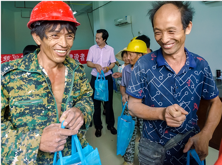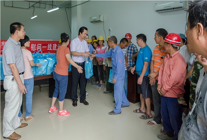 每到一处,施忠旗会长都向在酷暑中坚持工作的职工表示亲切慰问,亲手将一袋袋蜂蜜、毛巾、香皂等防暑降温物品送到每一位职工手中,并亲切询问他们的工作生活情况,叮嘱大家在高温情况下作业注意生产安全,文明施工,合理安排作息,注意身体健康,切实做好高温期间的防暑降温工作,确保大家度过一个安全、卫生、清凉的夏季。