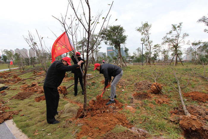 活动现场一派热火朝天的劳动景象。融旗小分队成员们纷纷领取了劳动工具,热情高涨地挥锹铲土、植树造林。有的挖坑、有的运苗、有的栽植、有的扶植、有的填土、有的拎水、有的灌溉,井然有序,认真细致。区内放眼望去,数千名志愿者在冬日里撒播着一片片绿色的希望,欢声笑语,辛勤劳作的氛围,如涌动的暖潮遍及满园。在大家的共同努力下,所领苗木统统栽植成功。