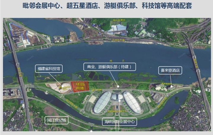 项目位于福州市仓山区东部新城会展岛上,背靠海峡国际会展中心,紧邻正在建设中的福建省科技馆(新馆),北望闽江与鼓山风景区——独享近300米的一线闽江资源,南接浦下洲路。